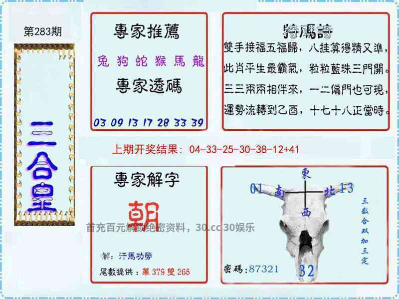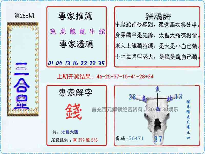 286期特码诗:牛鬼蛇神今期到,東宫西攻各分半,身穿鱗甲是先鋒,太監大將有機會。單人上陣猜特碼,是大是小自己猜,十二生肖叫老大,是鼠是龍自己猜。