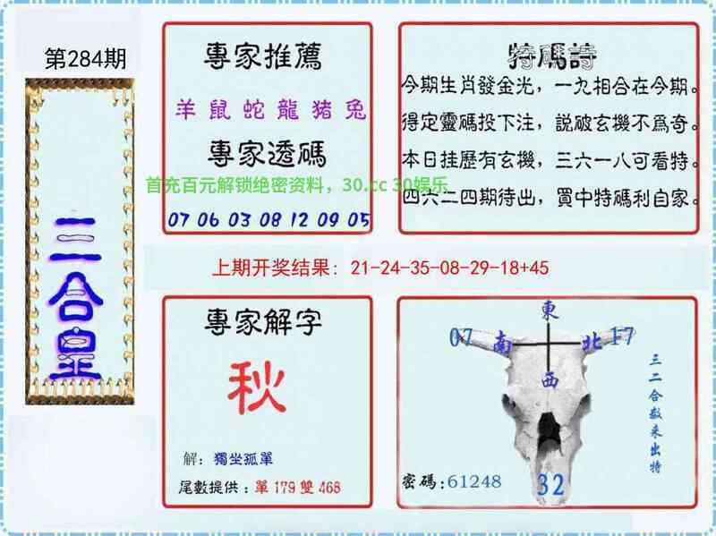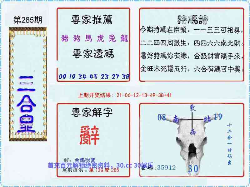 285期特码诗:今期特碼在兩頭,一一三三可相尋,二二四四同跟生,四四六六南北財。看好特碼你有緣,金銀財寶隨手來,金旺木死傷五行,六合有碼可中獎。